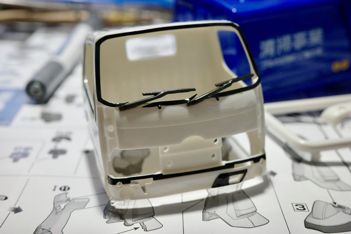 ただ、どうしてもシール貼りがうまくできそうにもないと考えられたワイパーと前部ウィンカーだけ水性塗料で部分塗装することにしました。
